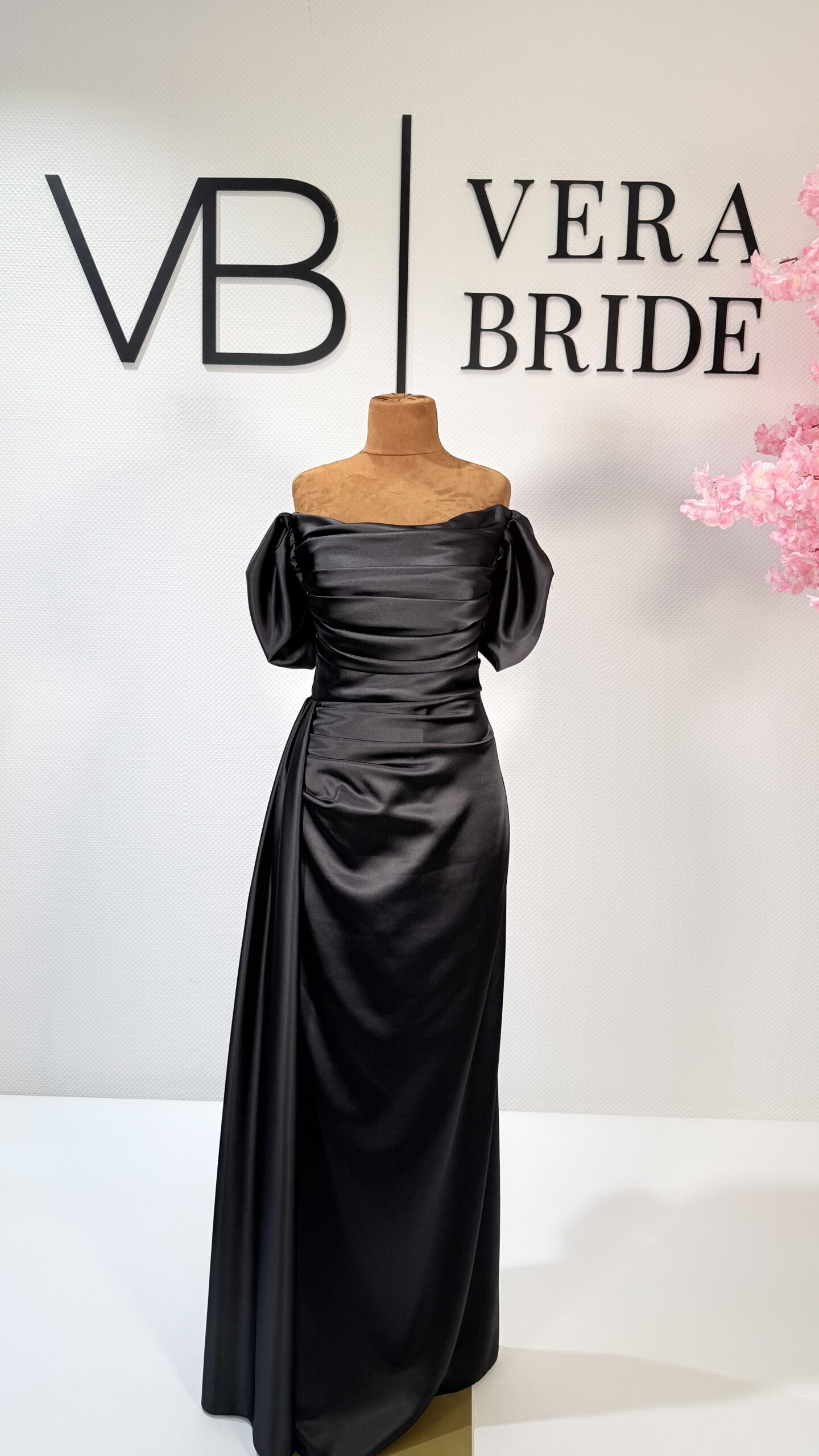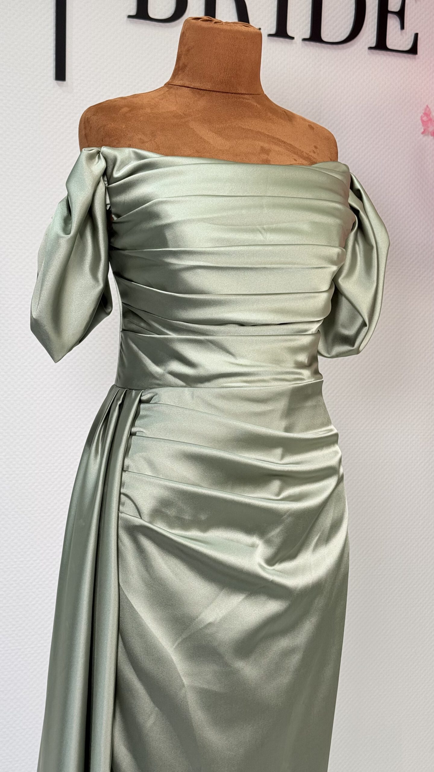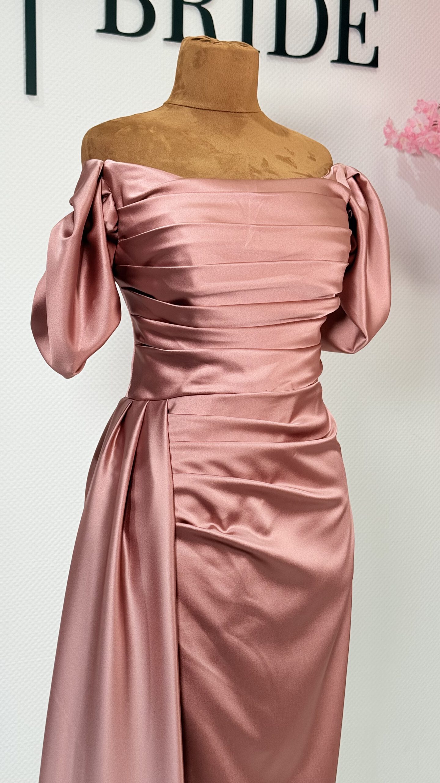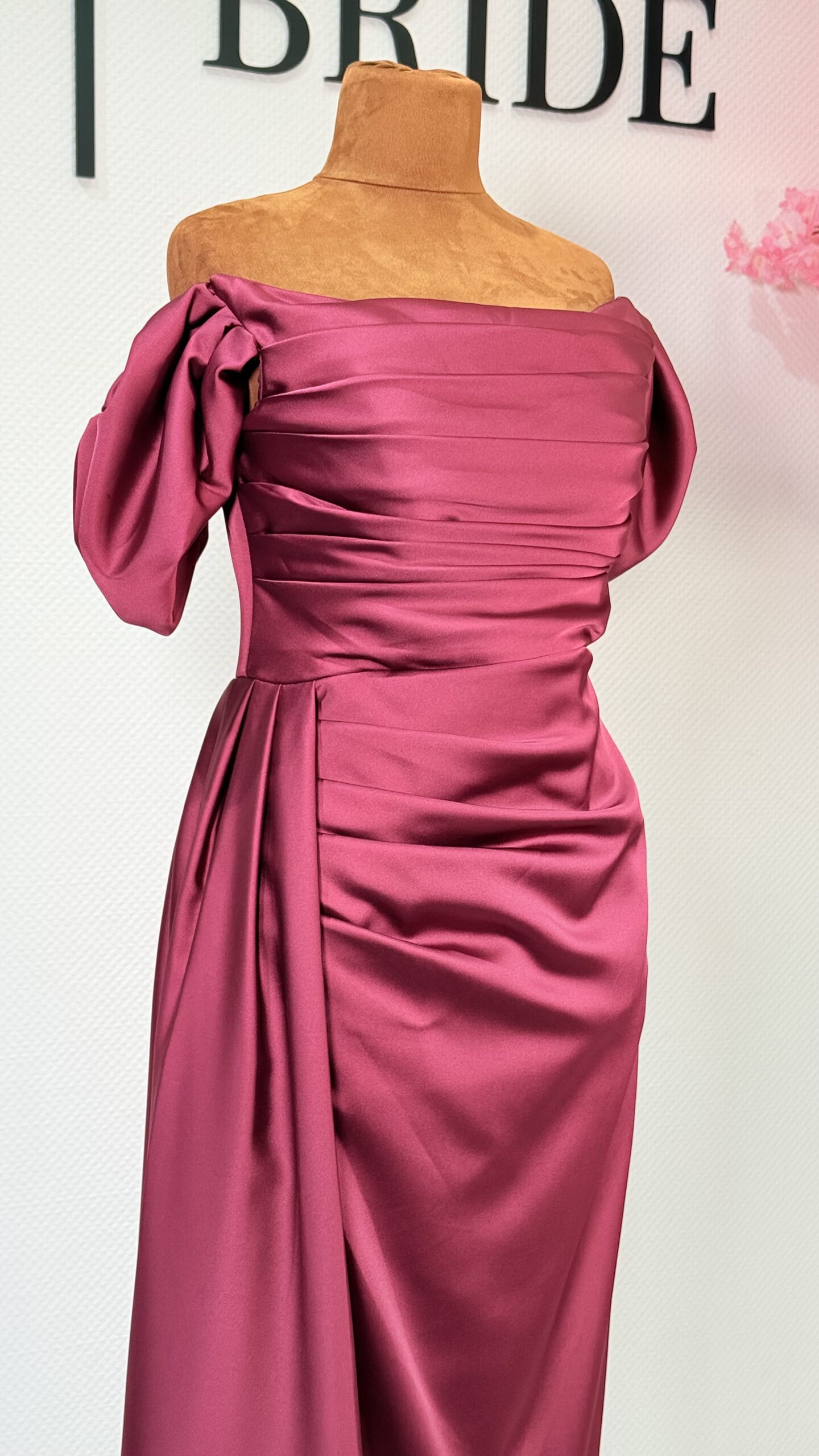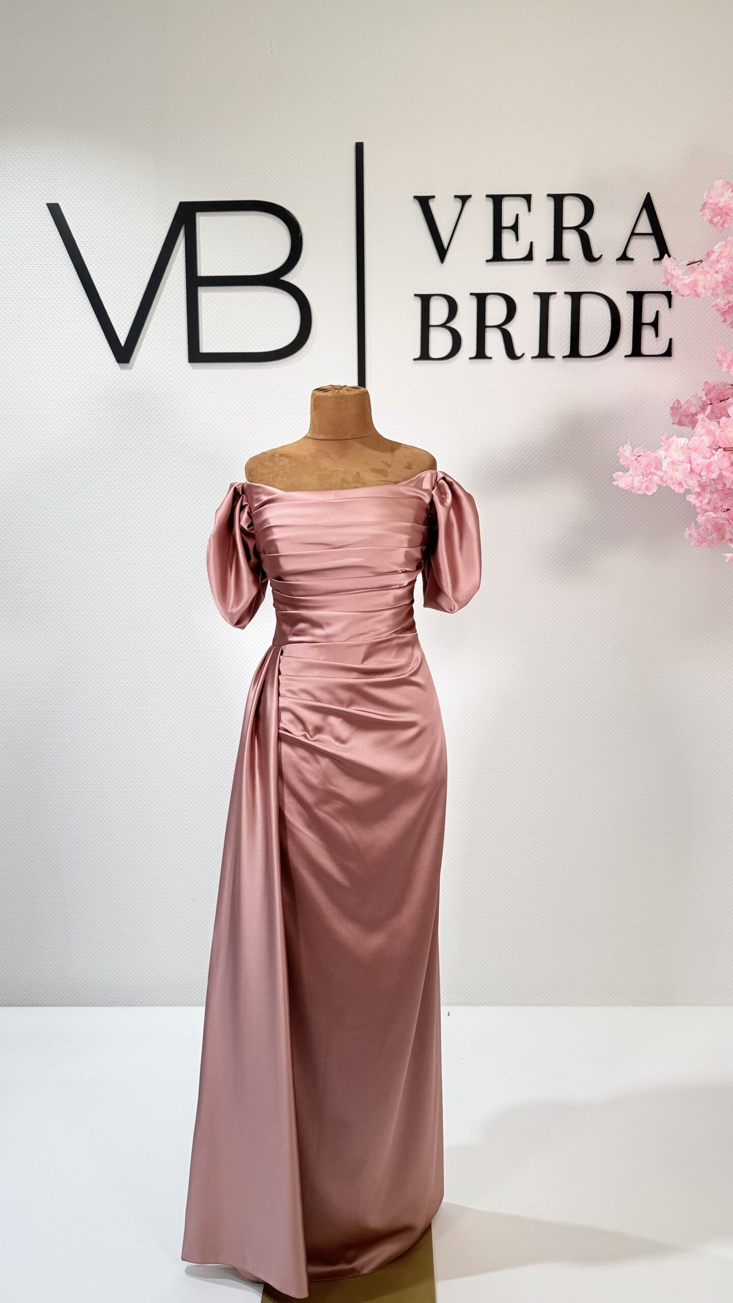 Elegantes Off Shoulder Abendkleid mit edlem Satin Glanz.